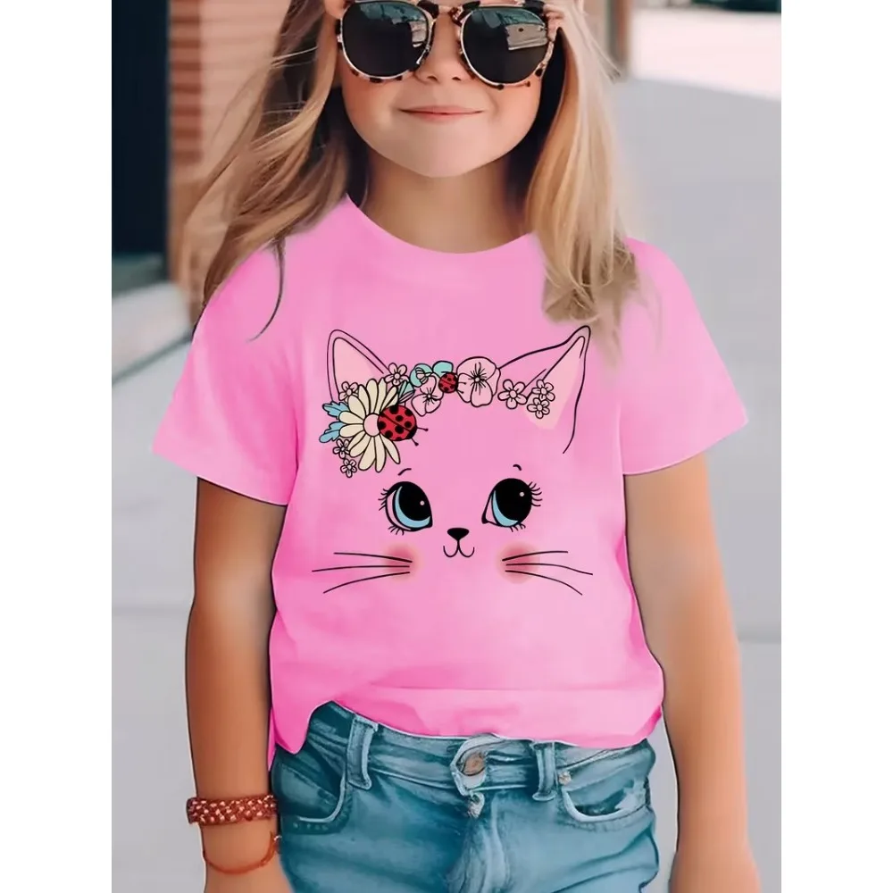 Summer Flower Garland Cat Graphic Print Girls TShirt Floral Fun Top Cotton Children's Short Sleeve Tee Cute Cartoon Kids T-shirt